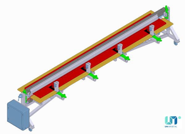 Na vsaki mizi je montirano prijemalo za držanje traku. Dolžina posamezne pomične mize je 500mm oz prilagojena